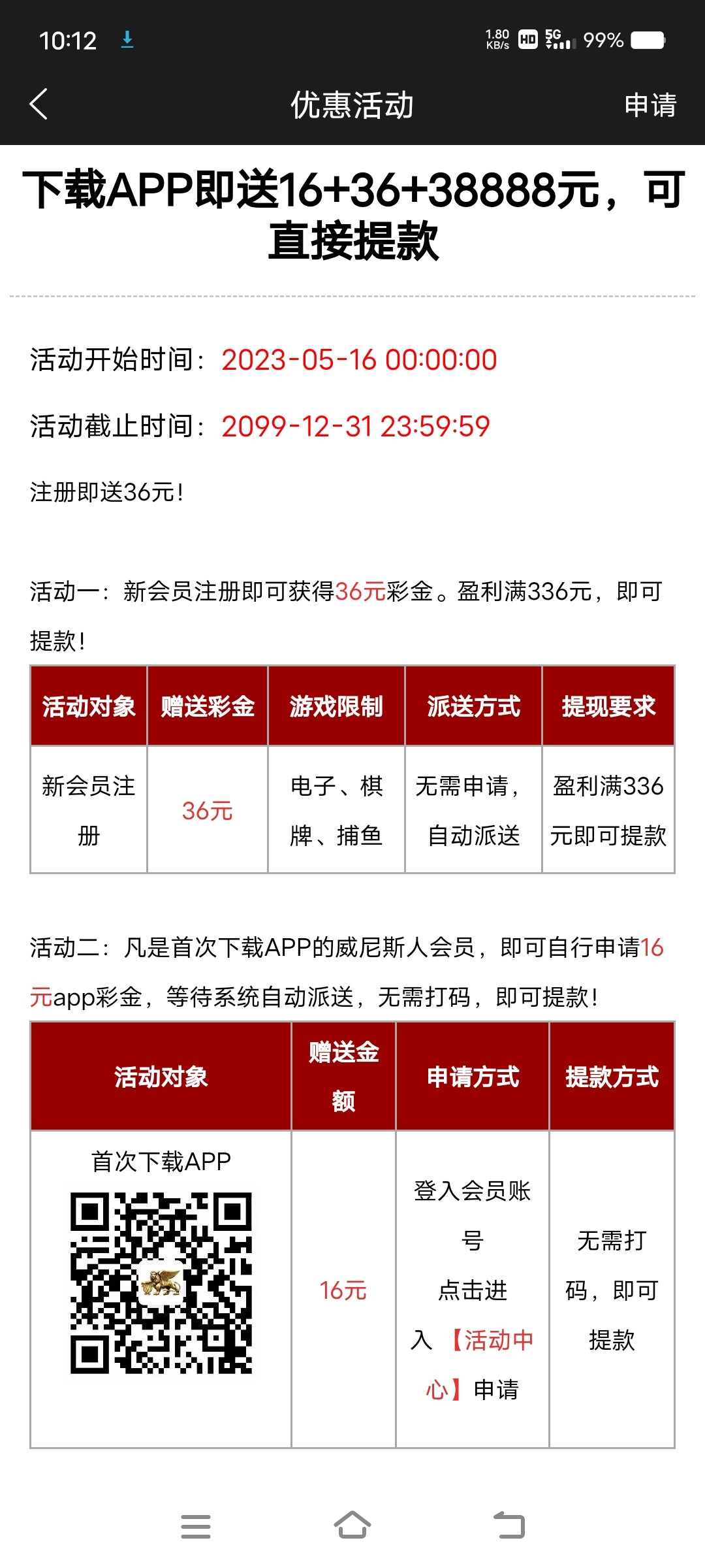 威尼斯送16+36彩金
