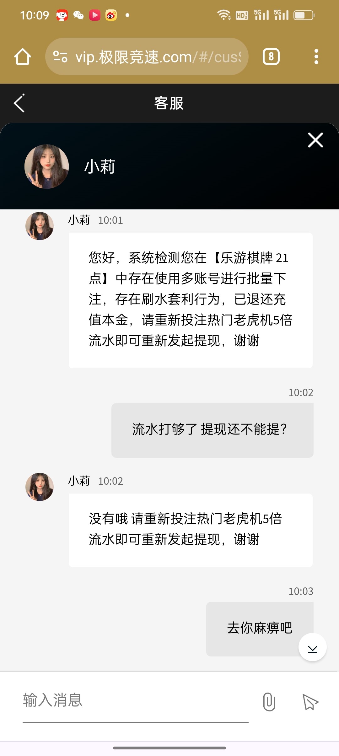 808钱包充18进去 打到217提现  说我套利。光退本金18,让我打老虎机5倍流水 玩麻将爆了 五百多出款了
