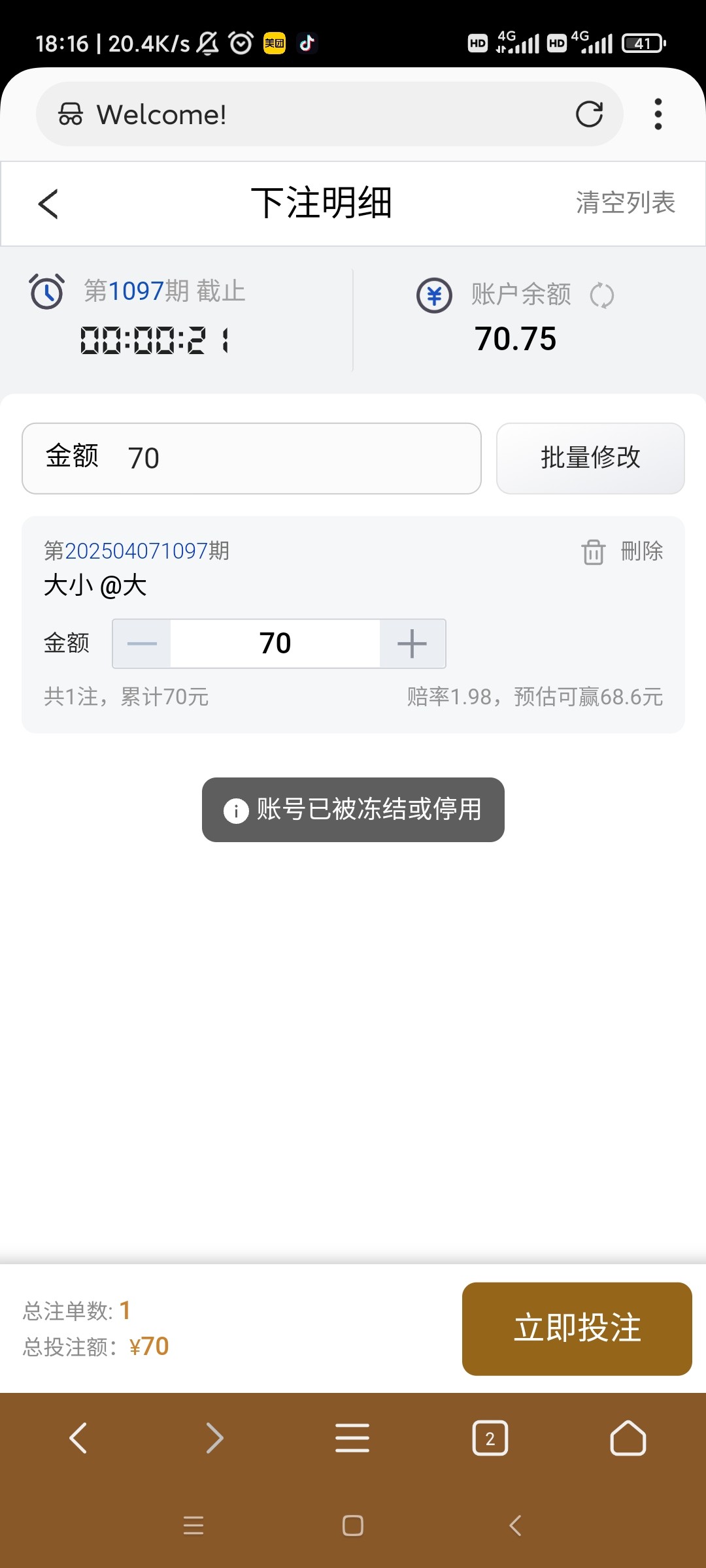 打到500准备提现显示用户冻结