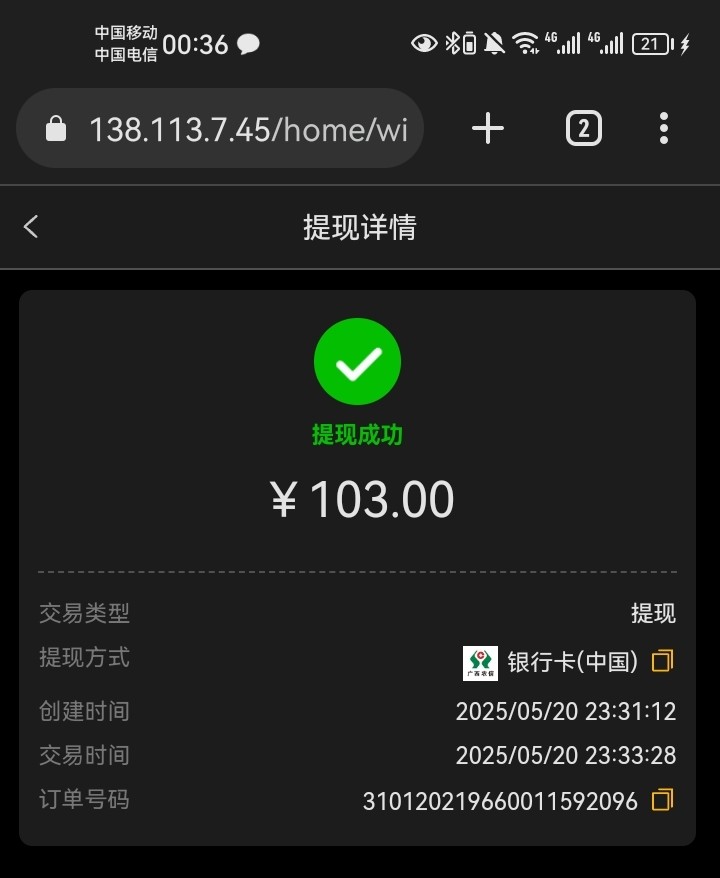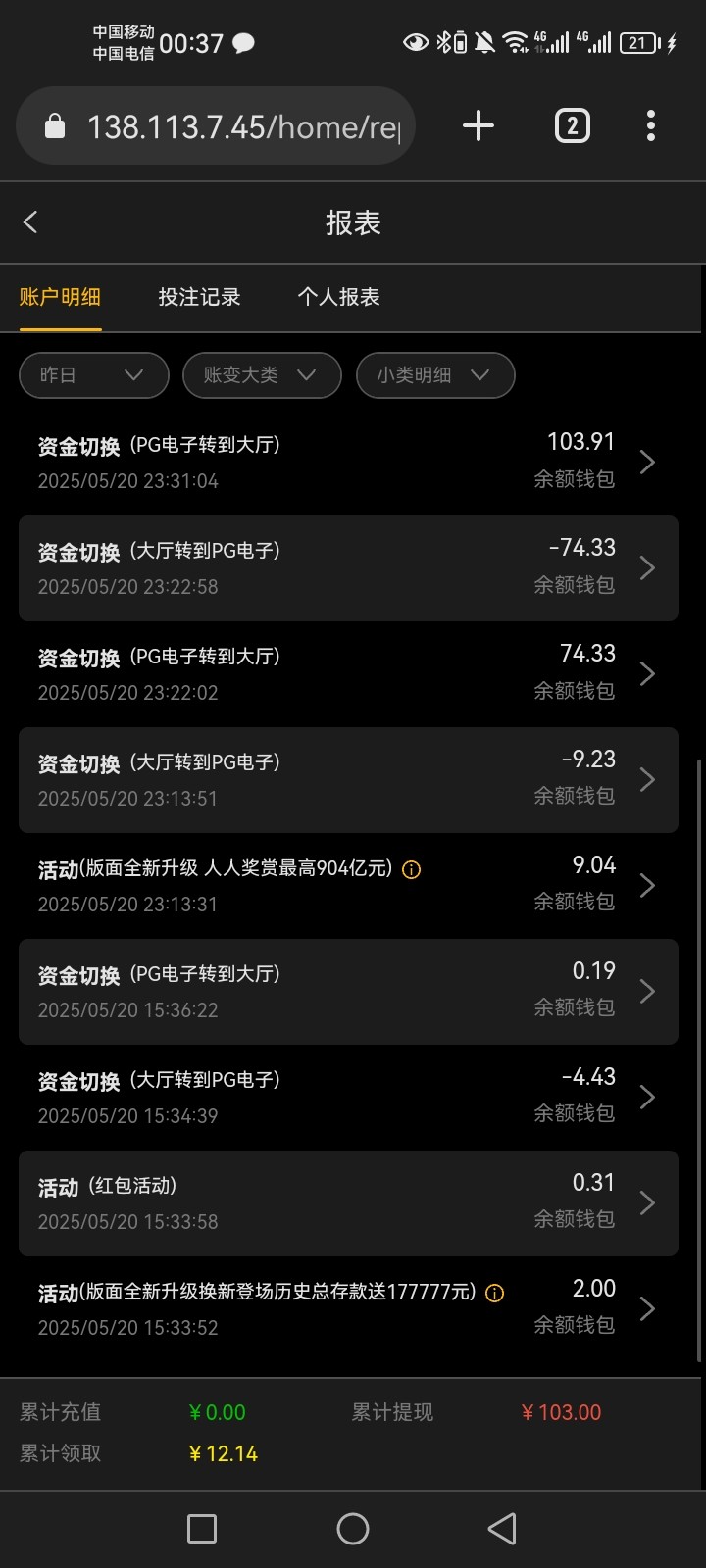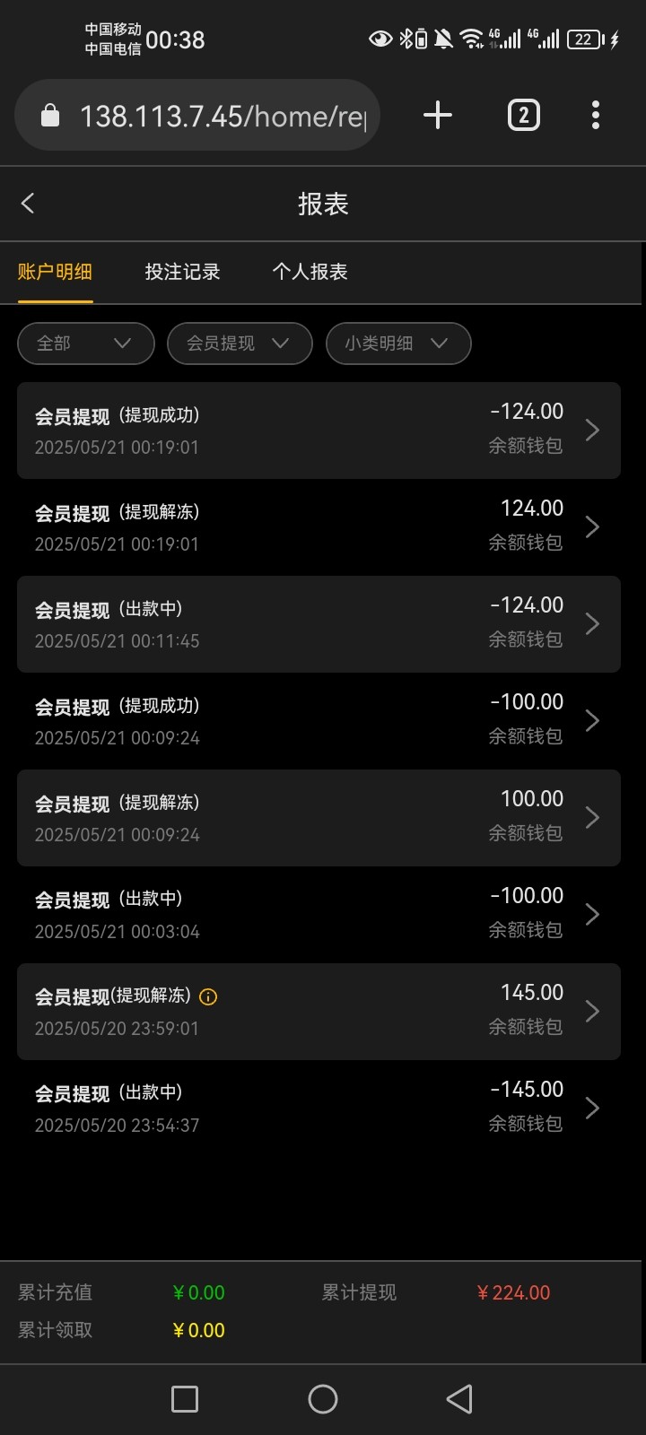 一个号回9块然后提了103,另外一个号充了10提224。