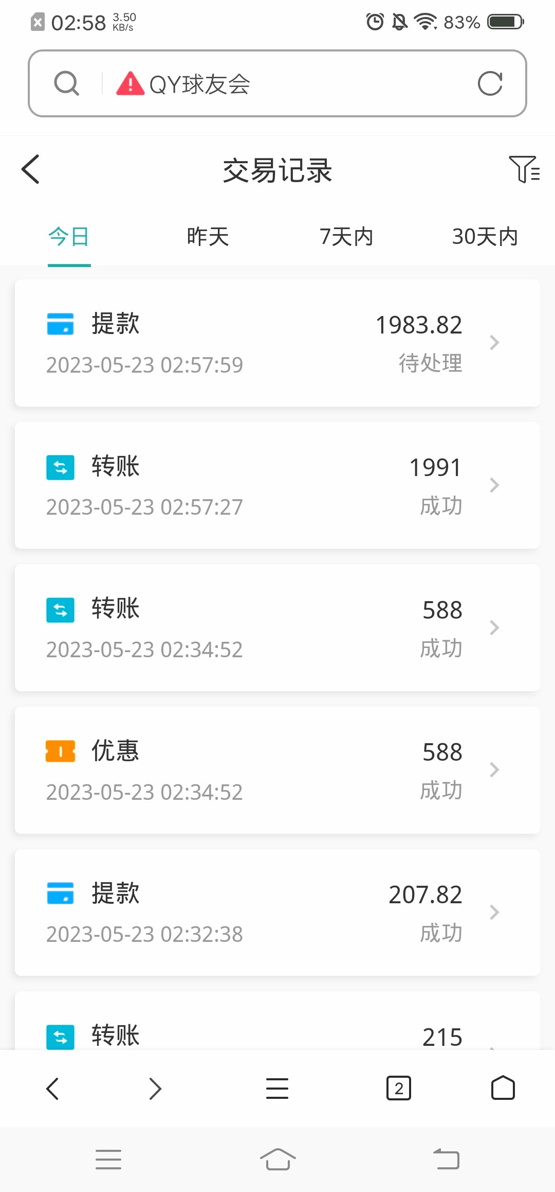 充了一百,提两百几分钟到,然后优惠券不是有回归历史充值送,我之前充过20个,领了588优惠券,5倍水,好了提现1900多,3点提的,等了3个小时说平台方审核,早上6点钟给我出了,这个我都知道,提多了就要审核几个小时,以前都是,都给我岀了。总共输了几万,这次提完过一阵子再登封号了qyh990.com