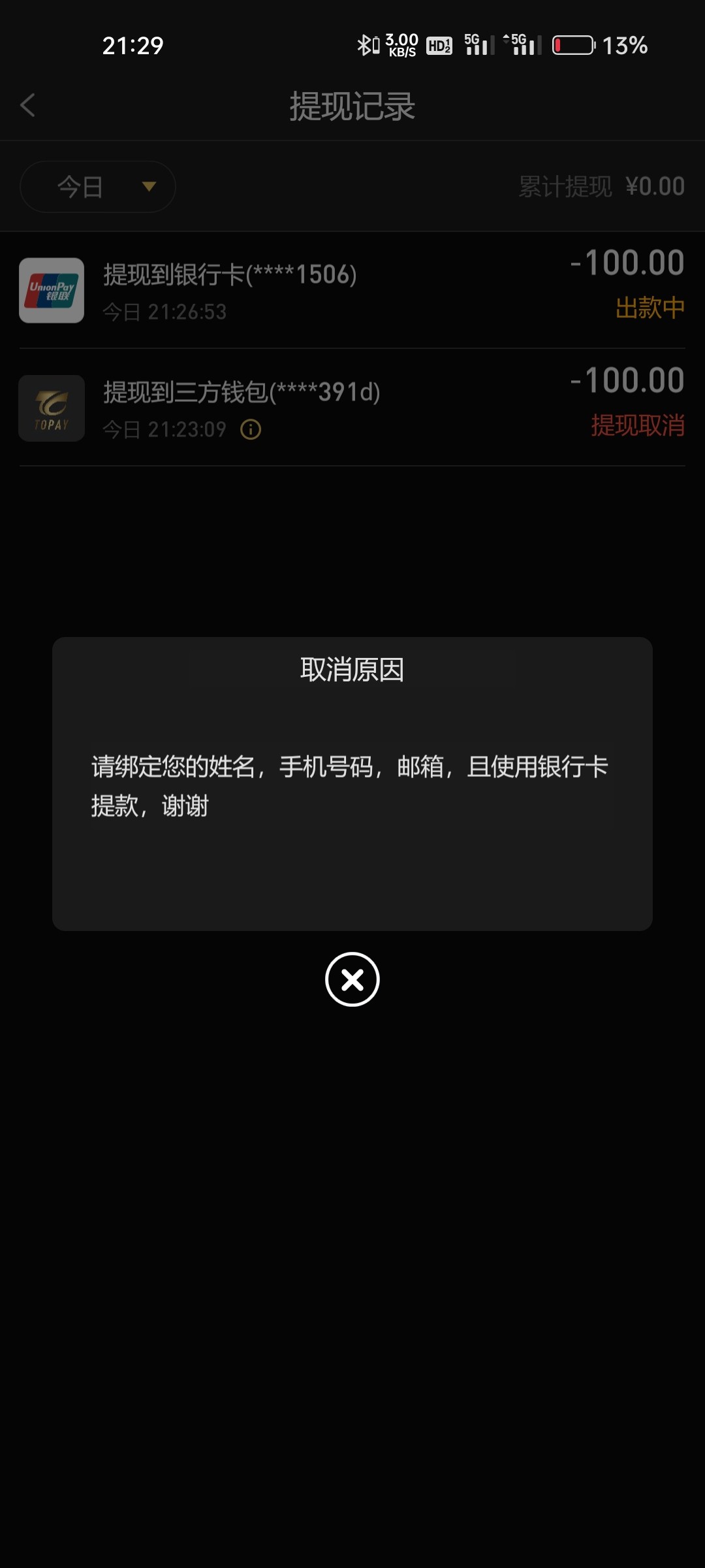 qq10421877 你是秒到吗 我也提了110 显示提现成功 但是没到账我是提的卡 我的是不是黑了