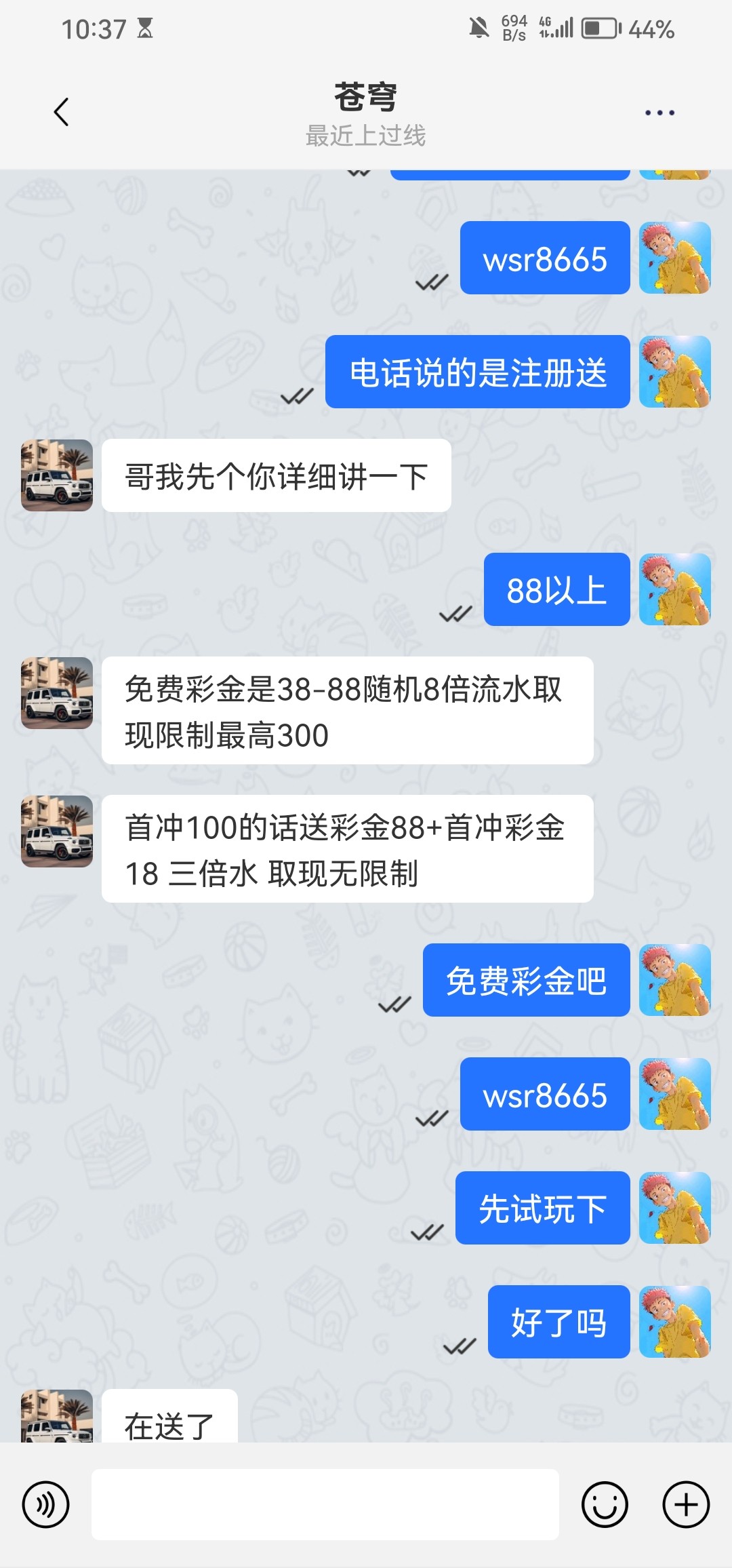 前几天收到电话特邀的 现在可以去加其他专员试试 我今天加了另一个专员又送了88 前几天的88出款271 今天的打没了