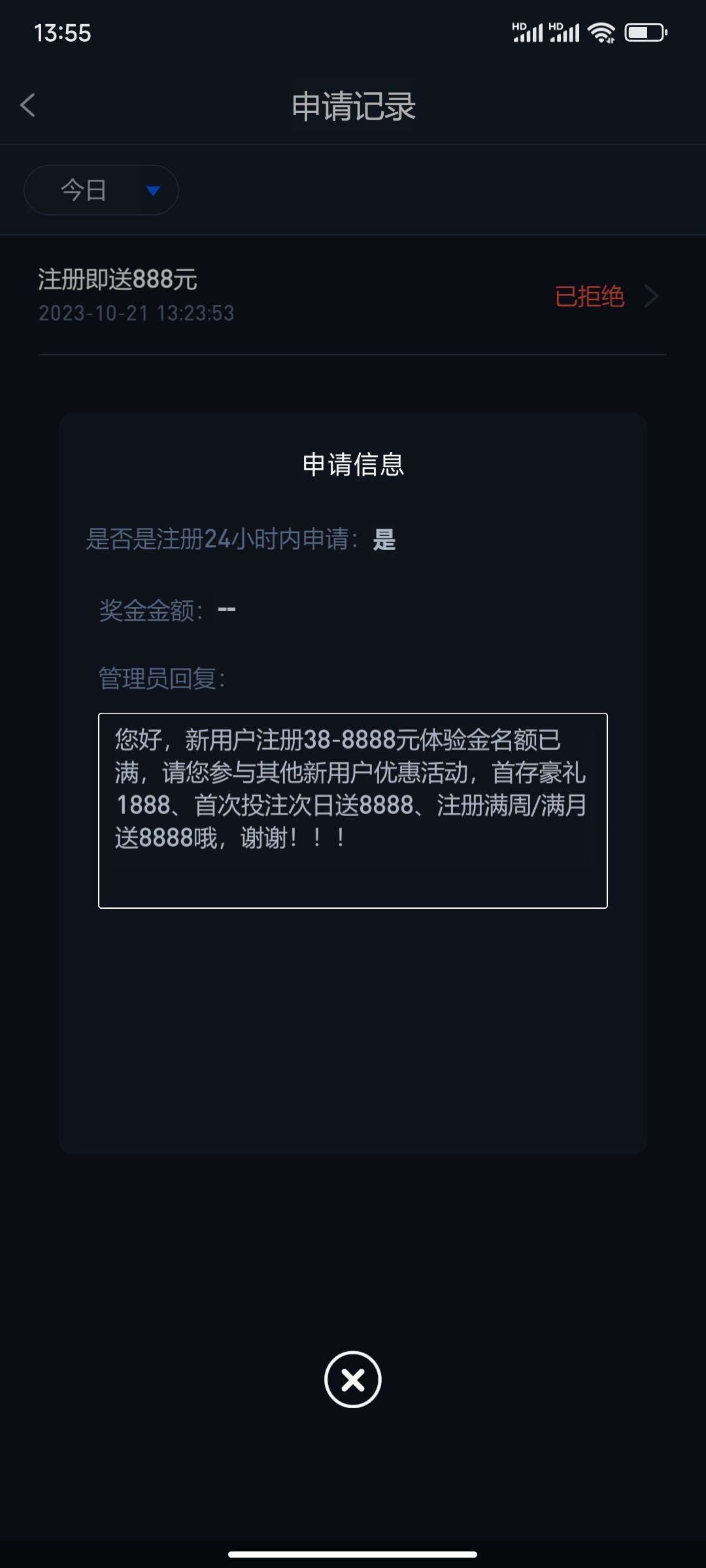 这个平台客服都是脑残,我昨天充值了2百挂逼了,今天去申请新人专属第三惠,今天打码次日送申请38元,同那个白痴说了1个多小心,又发图片,又发昨日流水,叫他申请,只会说您好,新用户注册18-8888元体验金名额已满,请您参与其他新用户优惠活动,首存豪礼1888、首次投注次日送8888、注册满周/满月送8888哦,谢谢!,讲来讲去都不明白,日狗了,搞到一肚火,到最后搞到一个多小时才明白,才送了38,也挂了,电孑才打40多流水,垃圾平台