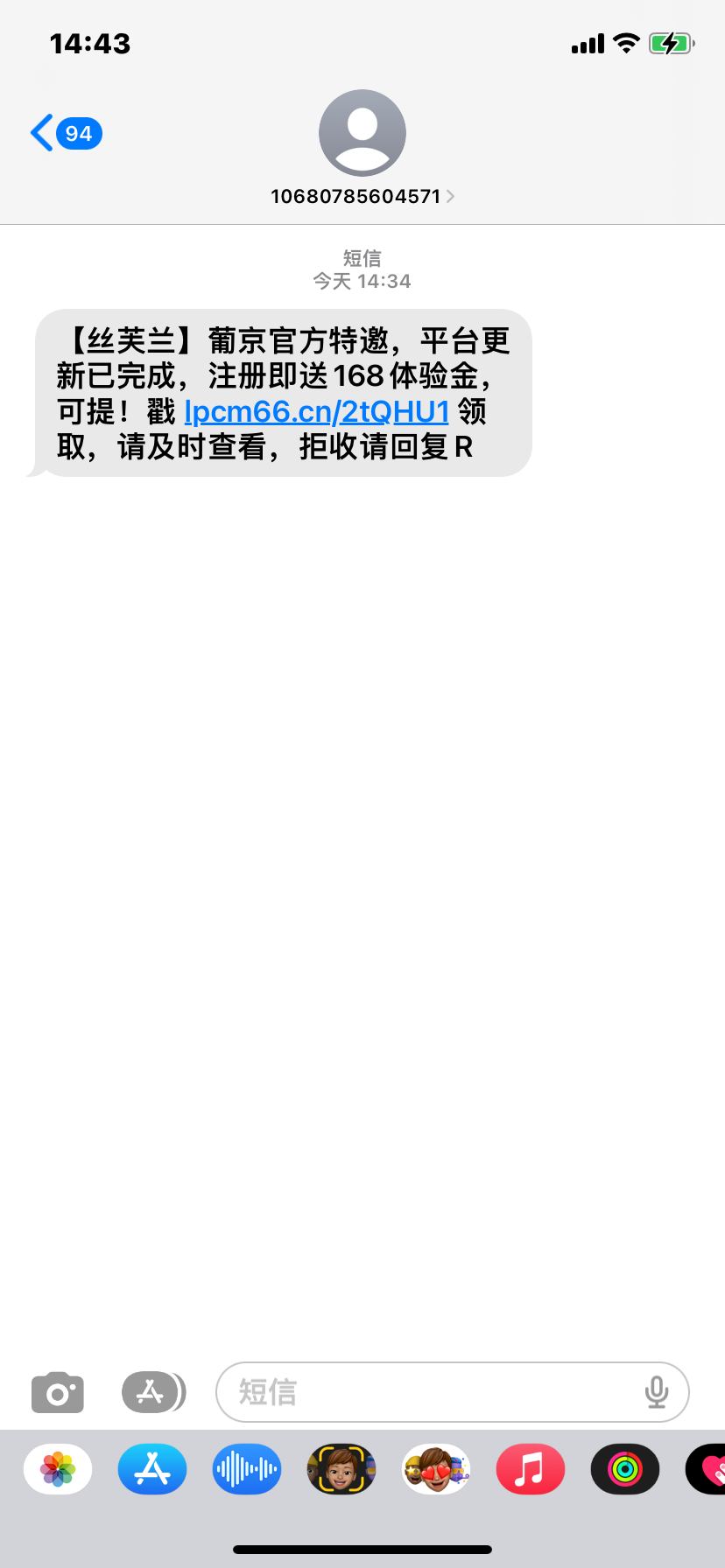 短信特邀168 888可以提【丝芙兰】葡京官方特邀,平台更新已完成,注册即送168体验金,可提!戳 lpcm66.cn/2tQHU1 领取,请及时查看,拒收请回复R碰瓷
