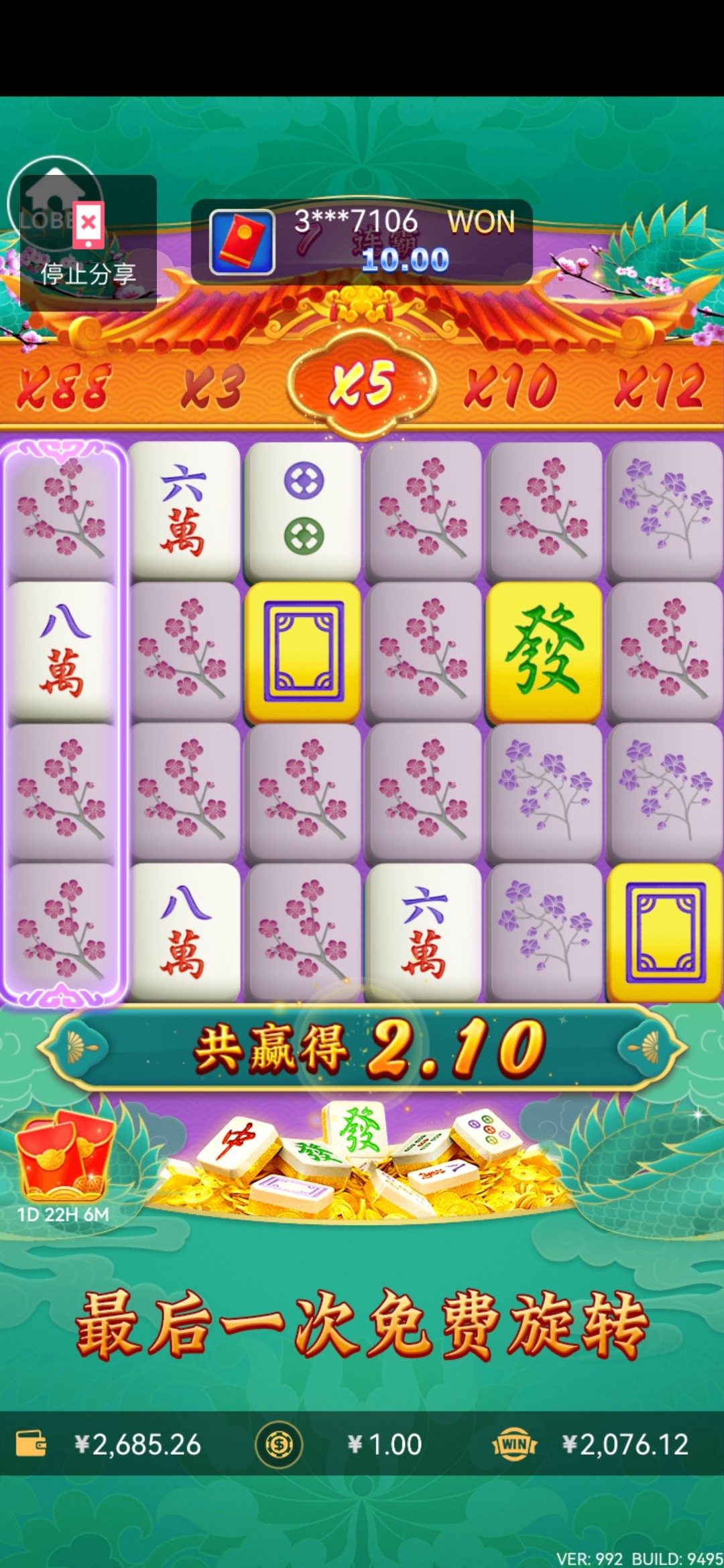 可惜了第六排没牛子呀,这麻将3纯属30一发闲的无聊买着玩几下爆的