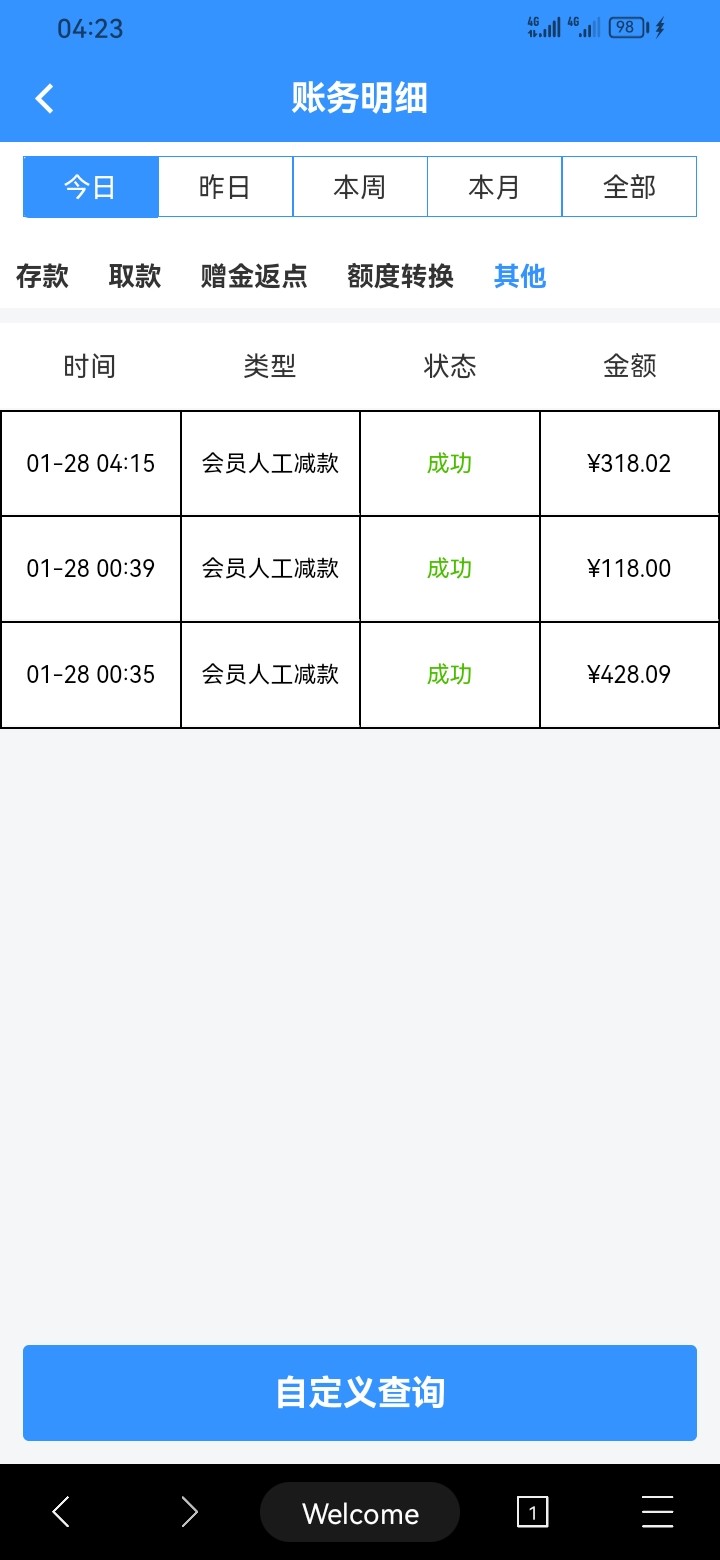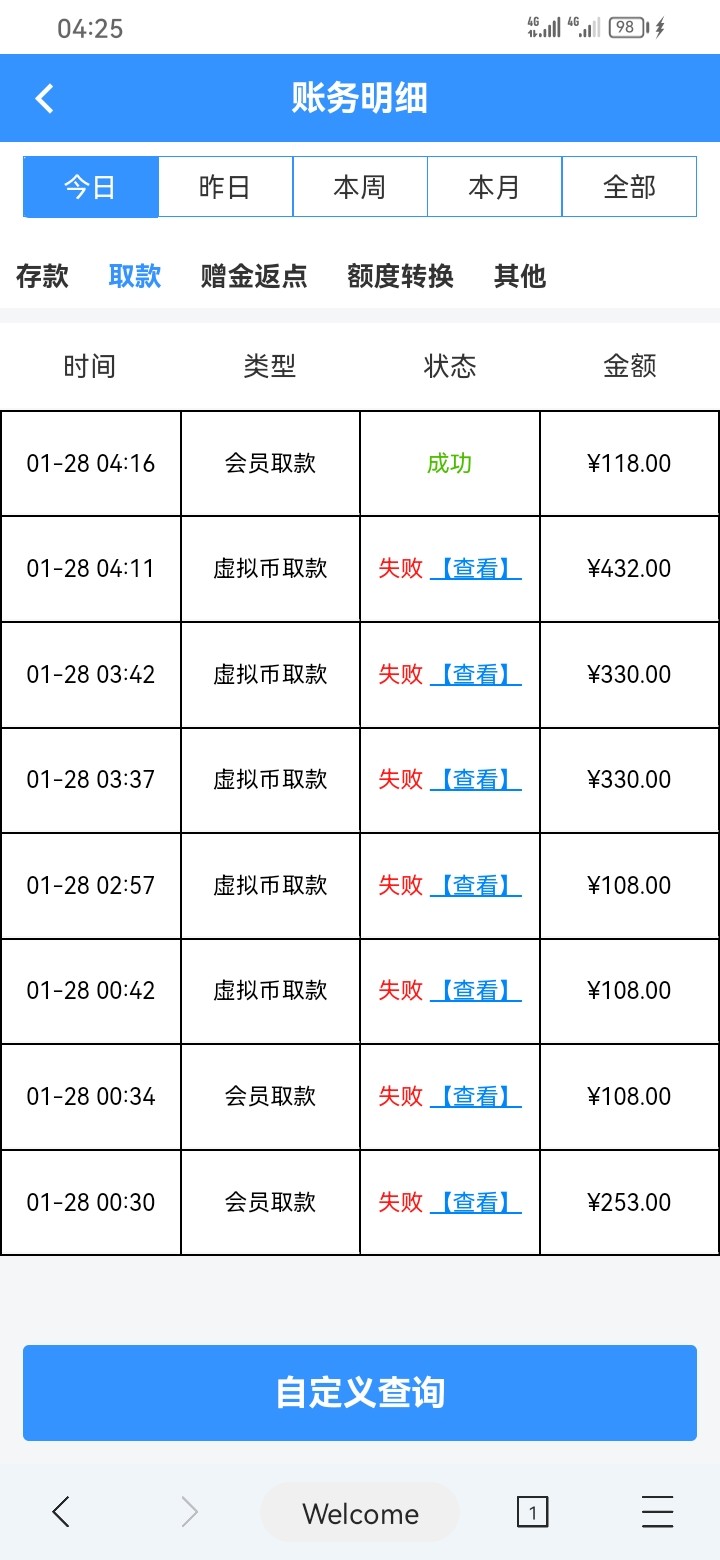 一开始签到几块钱打上去五百左右,然后提现退回,然后说只能出108,剩下人工下掉了,提现过一会又退回,要求充一百,冲完打完流水之后,又变成只能提118,又人工下掉了,一百本金,我打了差不多四个小时,就赢他18块钱,我日他妈妈