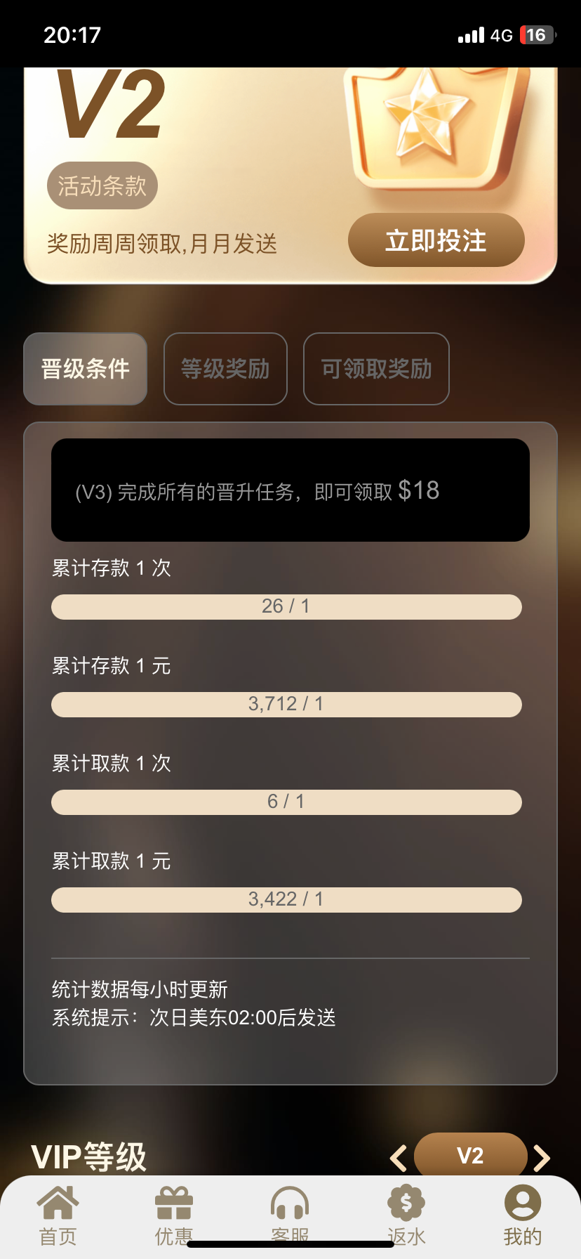 我有个10年台,vip9从来没发过一毛钱,不过每个月累计充1000,下个月初送500月工资。2000块钱对刷每个月稳定赚500彩金