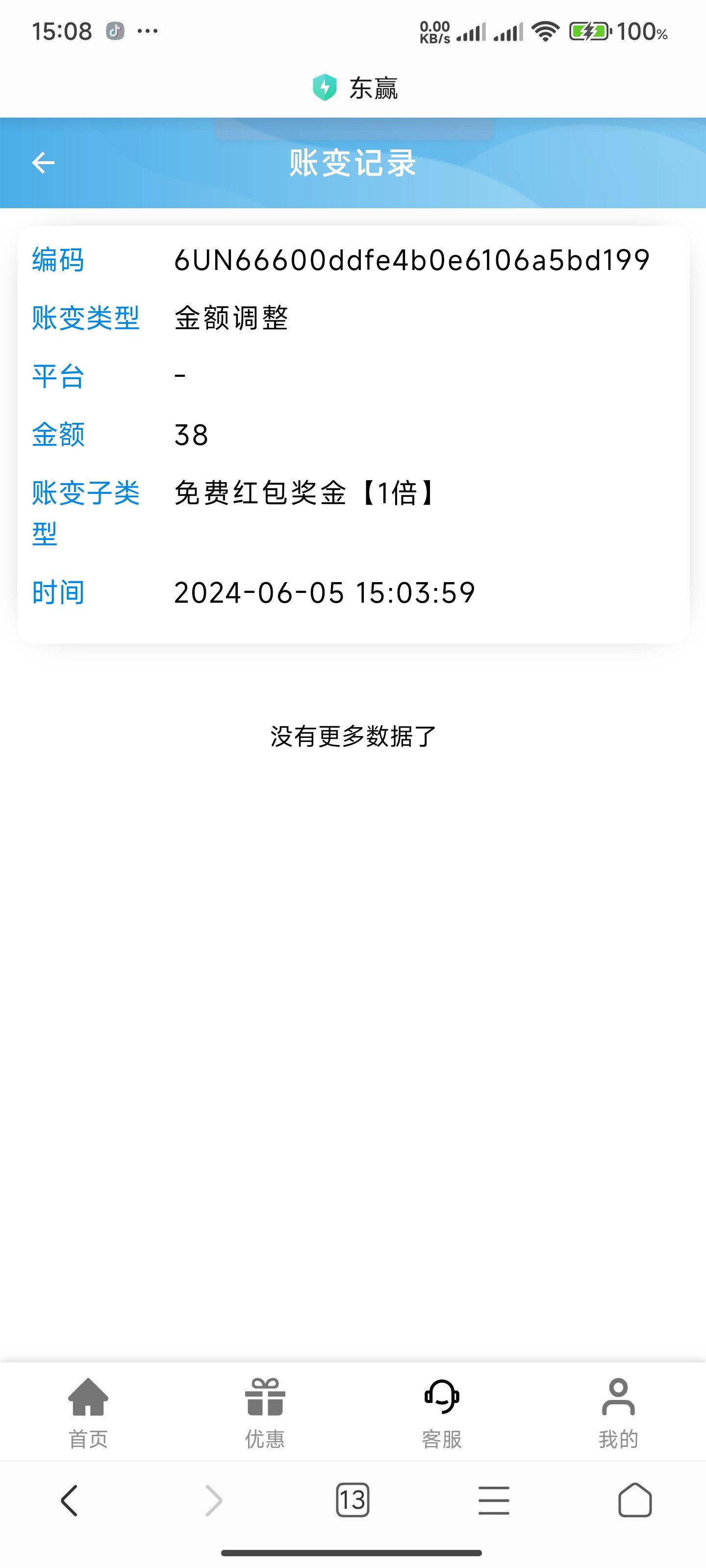 东赢有号的看看有没有短信,没有短信也可以去找客服碰瓷,给我送了38