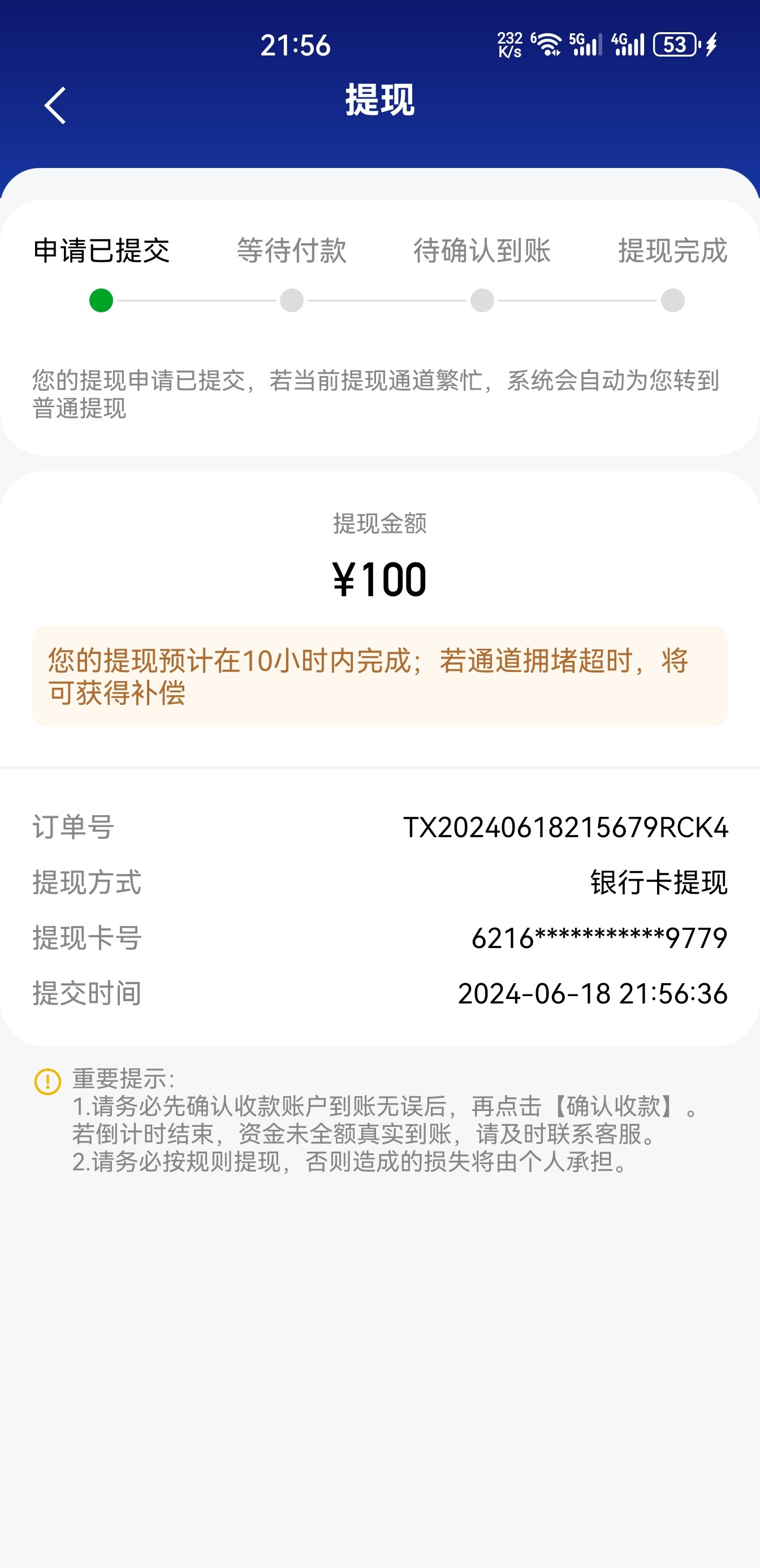 提了300,还有100确认出款中