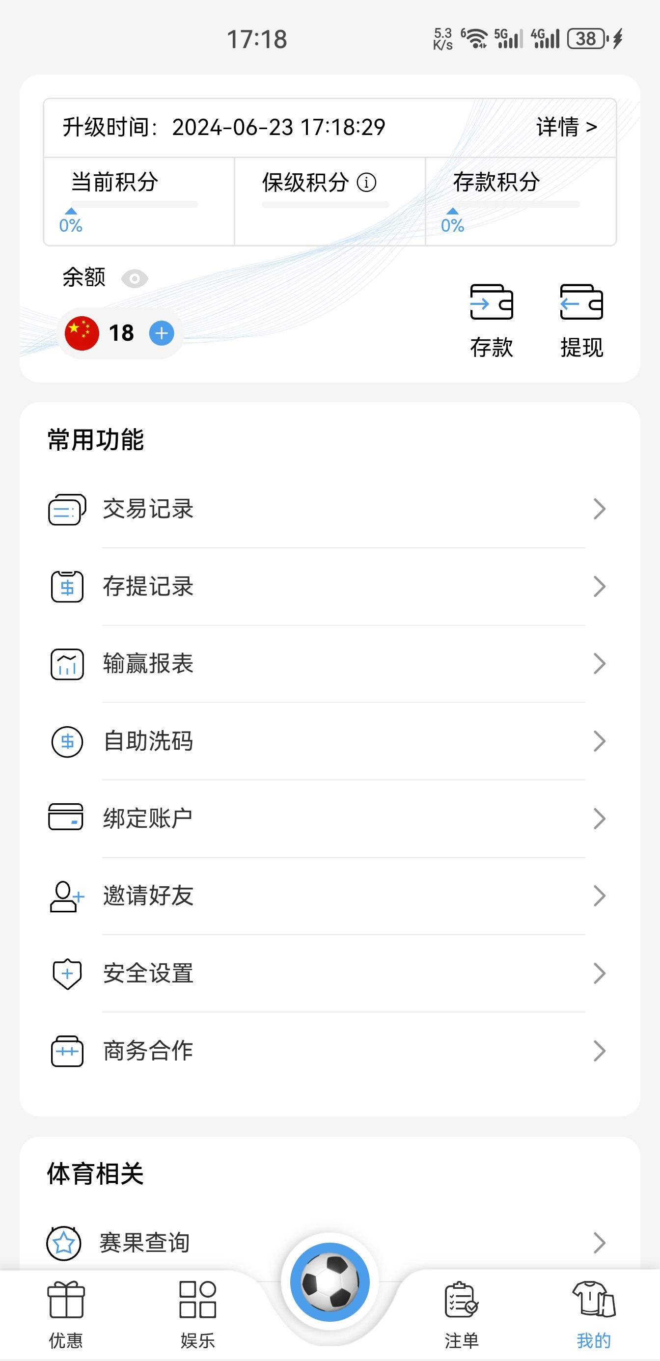 新用户手机号注册秒18彩金5倍流水只能体育,不知道是不是特邀才秒,没秒无视即可,具体自测切记勿充值。
