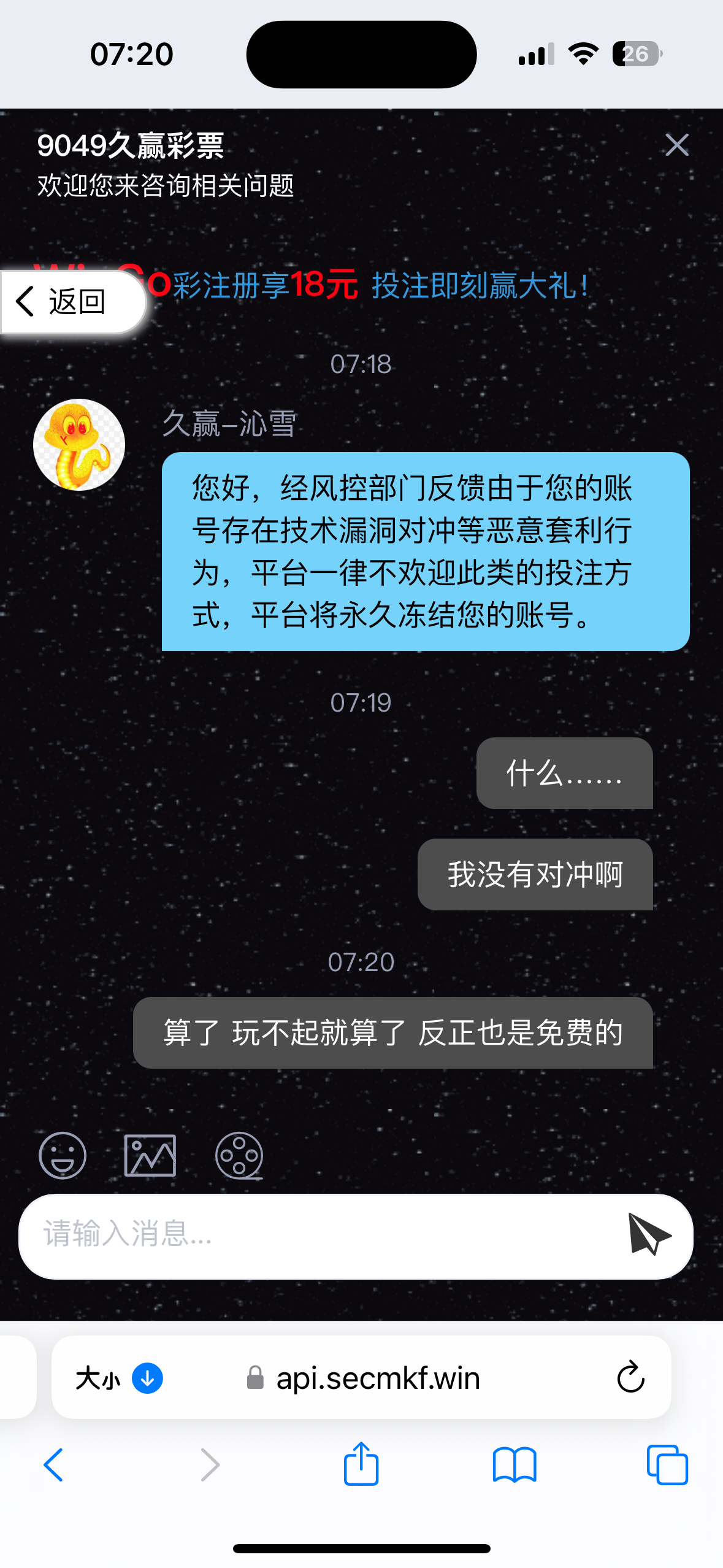 您好,经风控部门反馈由于您的账号存在技术漏洞对冲等恶意套利行为,平台一律不欢迎此类投注方式,平台将永久冻结您的账号。