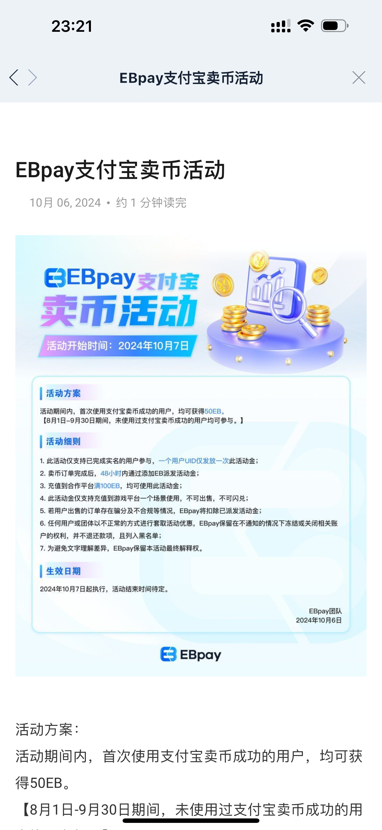 找一个支持提ebpay的台子提款一-百, 然后用支付宝卖了之后,会在48小时之内派送至账户50eb,我的是21号卖的币,今天才送过来,只能充台子不可出售
