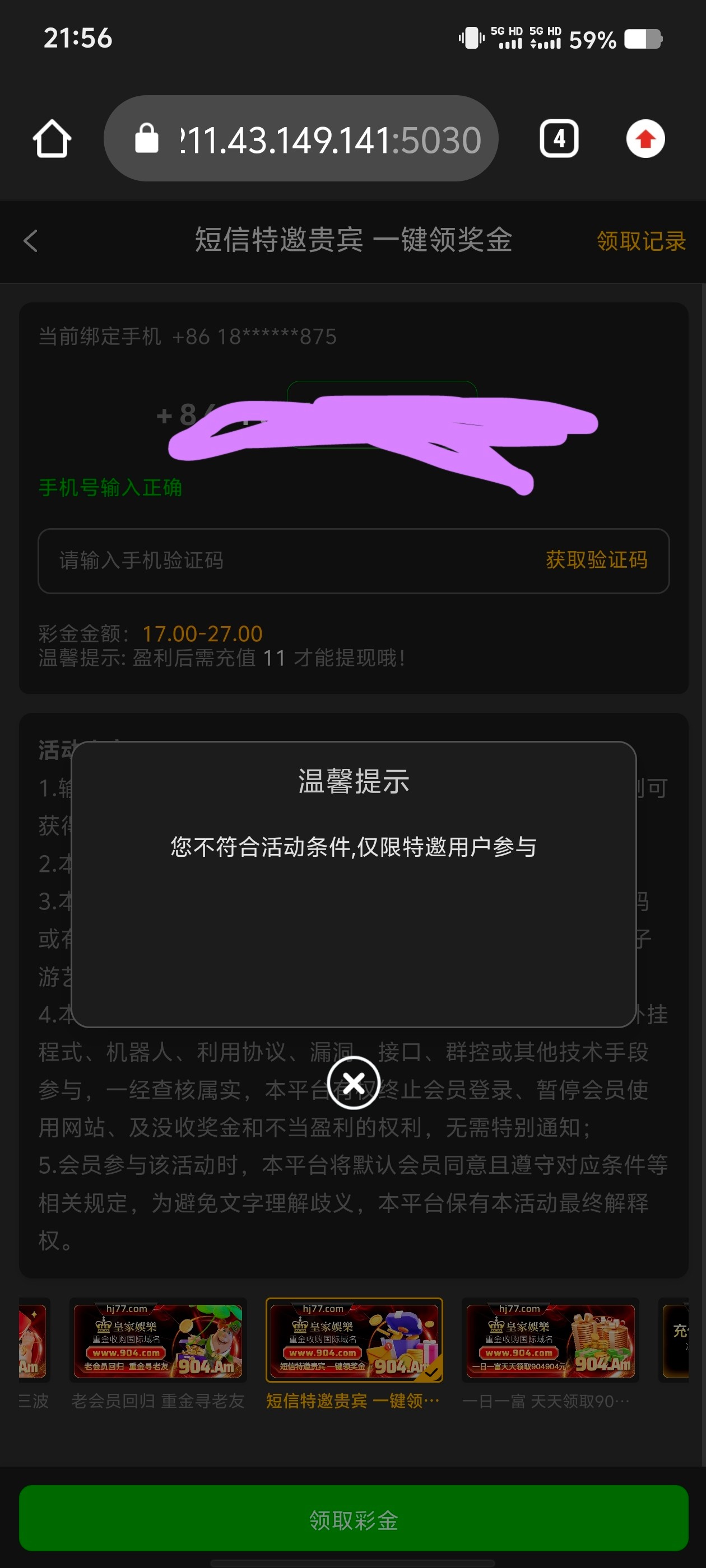 这还是本人第一次发帖,简直是忍无可忍了。说说刚刚发生的事!今天收到了一条狗庄的短信,打开看了下,里面有特邀用户验证手机号码可以领取彩金的,然后按照正常流程走,注册,绑定手机号,绑定收款钱包,以为就可以正常领取了。就是在这个时候,刷新三观的时候到了。。。。。。