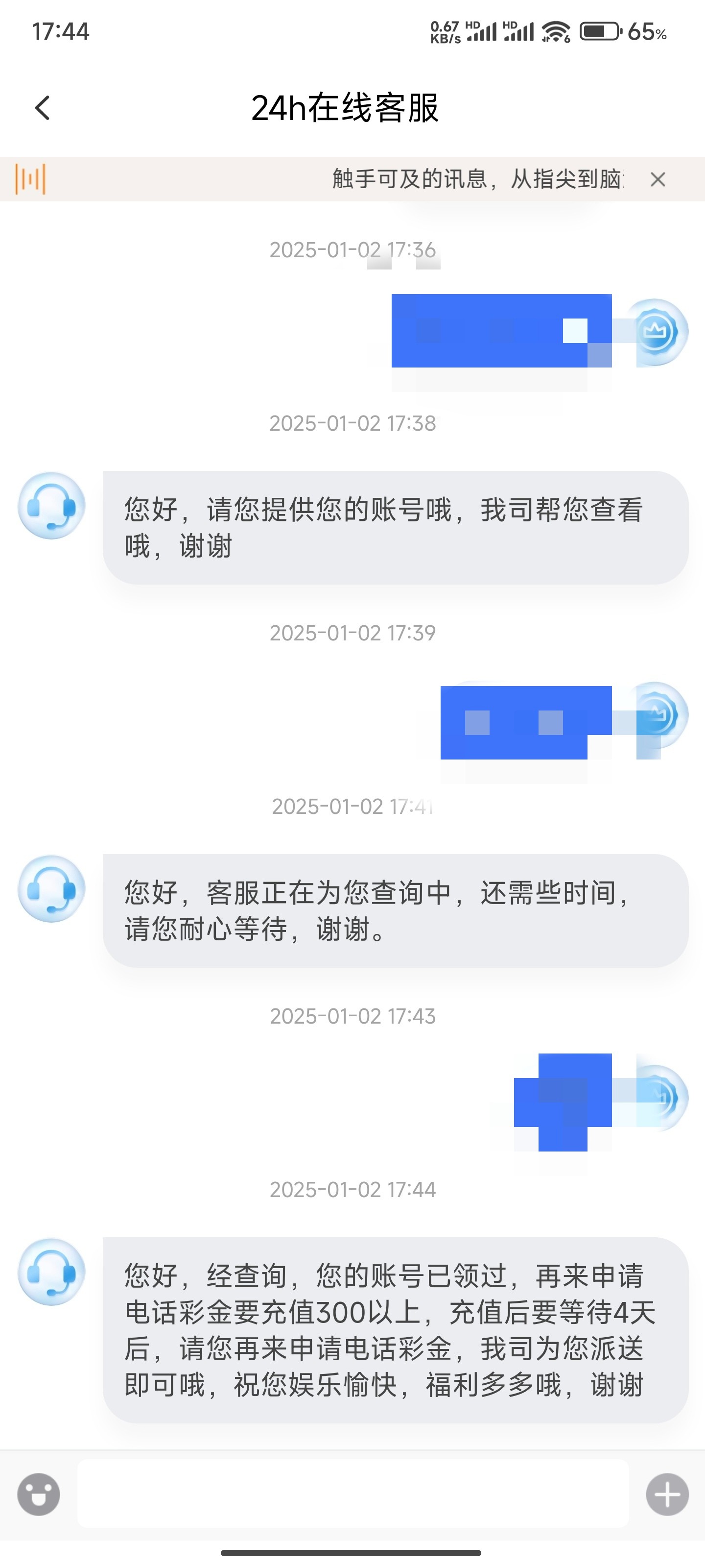 上个月第一次领没充值过领了388,前两天再去问客服碰瓷,说充了三百等四天就送,今天第三天等不及了去试试,给我送了哈哈