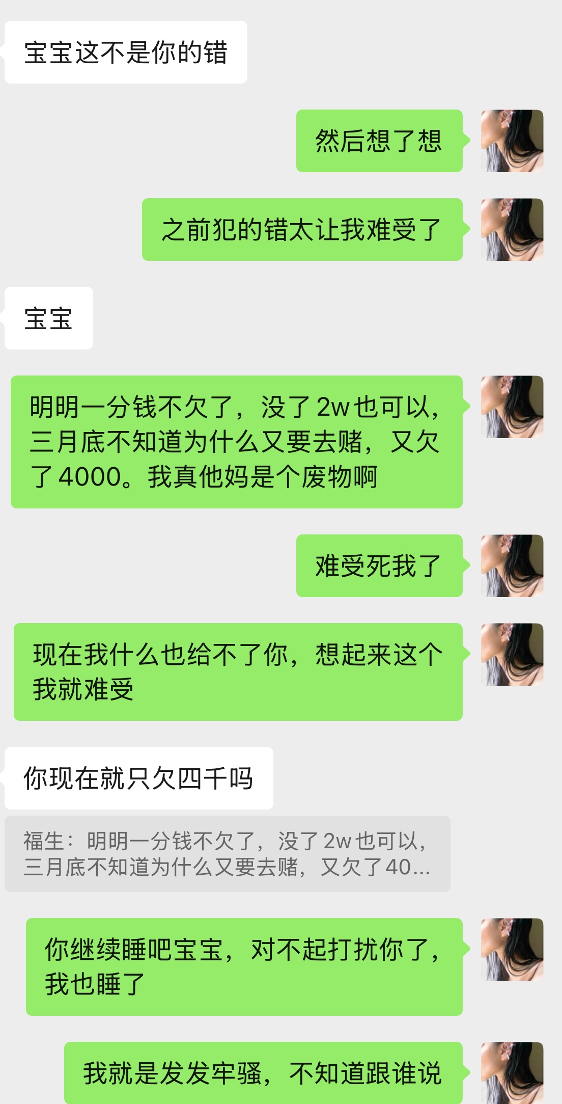 明明说好不赌了 今天又输了500 对不起我女朋友还有家人 谈了一年了 只跟着我吃苦 能不赌就不赌 我以后再也不要做这个畜生了 她还是个学生 2月3号那天倒下一分钱没有了 没钱吃饭了 把生活费都给我转过来了 今天我还跟她吵了一架 我真不是个人 我真是个废物