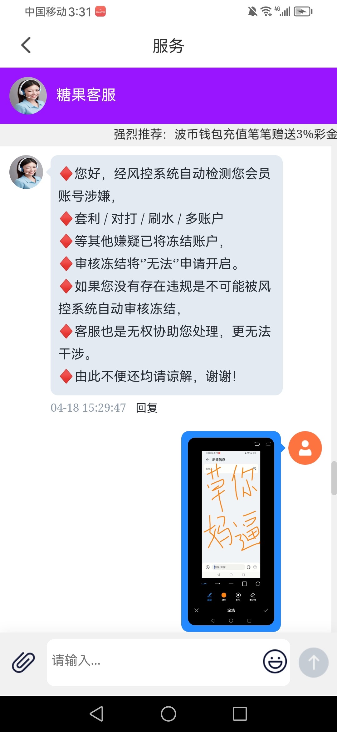 前两年被波币黑的5000。还没出呢,还打电话来。这个逼台。老子充值3000,他让我提波币,进去直接冻结波币账户。说我关联号p图