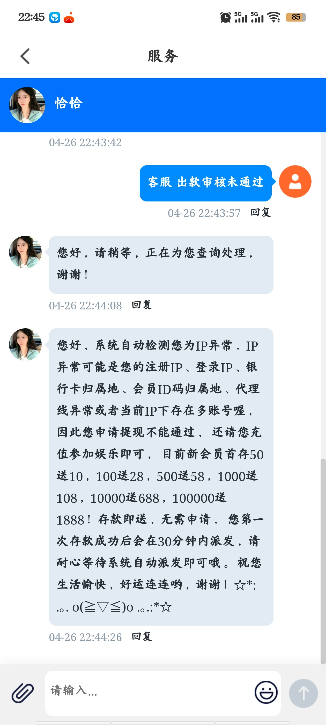 下午接到电话的,出款一百,等一个多小时,说多账号,呵呵了,黄播现在都玩不起,月初的幸运直播也是直接黑