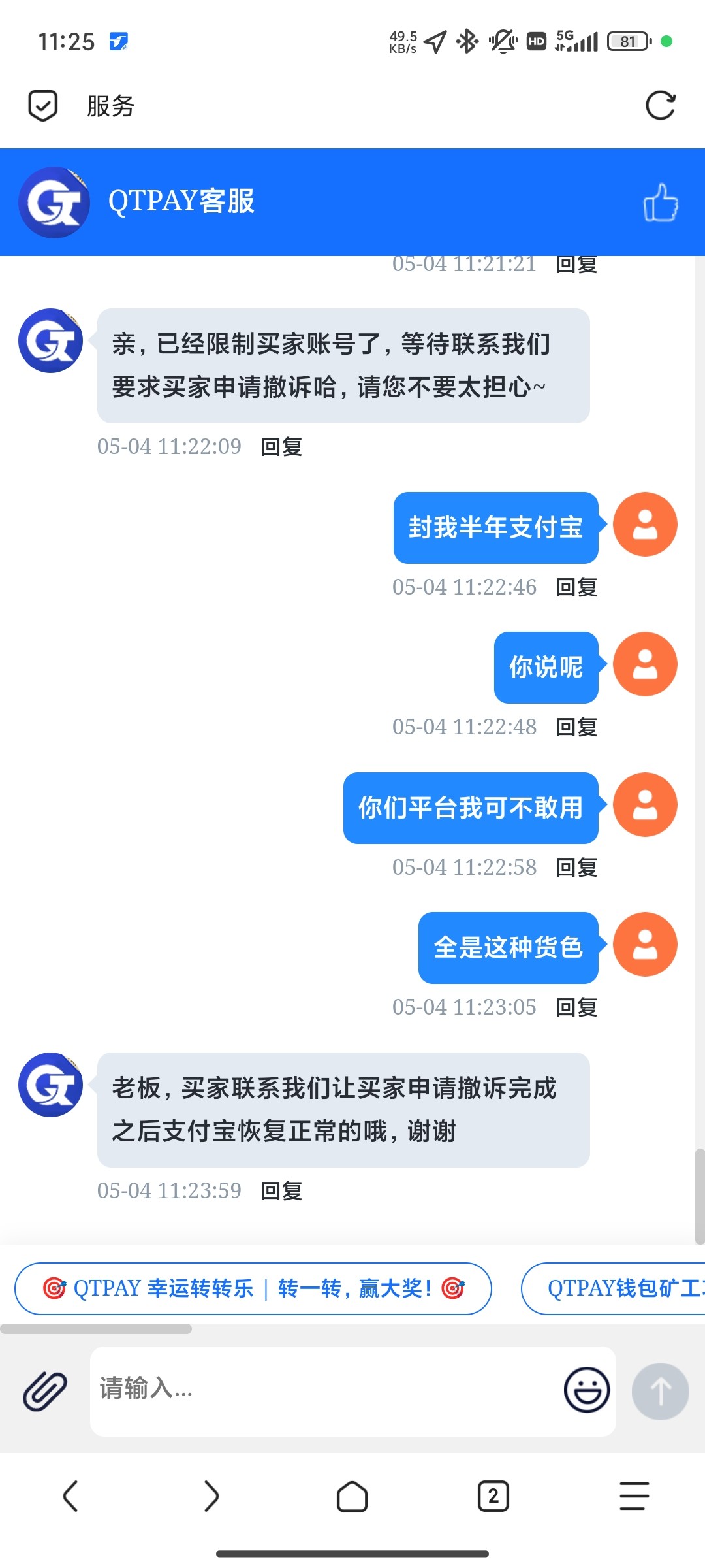 qt钱包卖币,突然收到支付宝限制。一看支付宝被封半年。还编一堆理由投诉我想要我退款给他。老子大不了注销这个支付宝,。这白痴输傻了