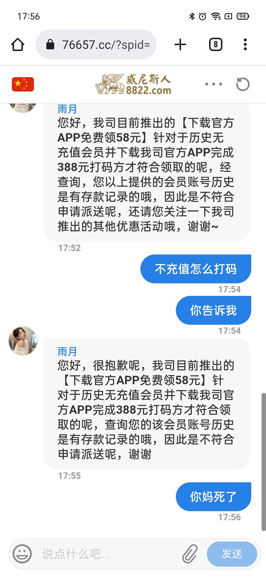 我冲了100送88出了500 然后申请58死完了