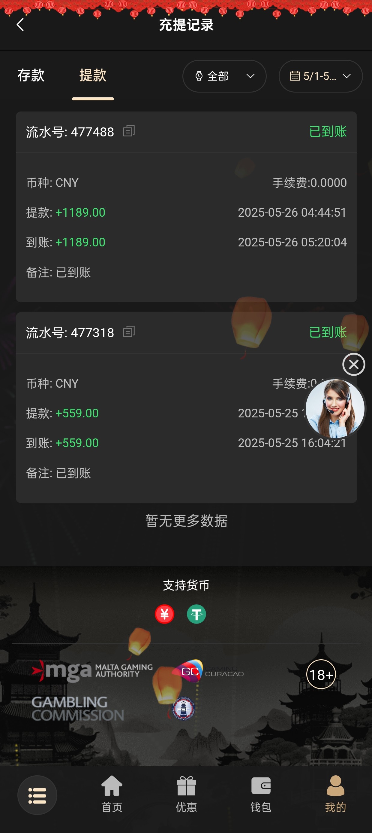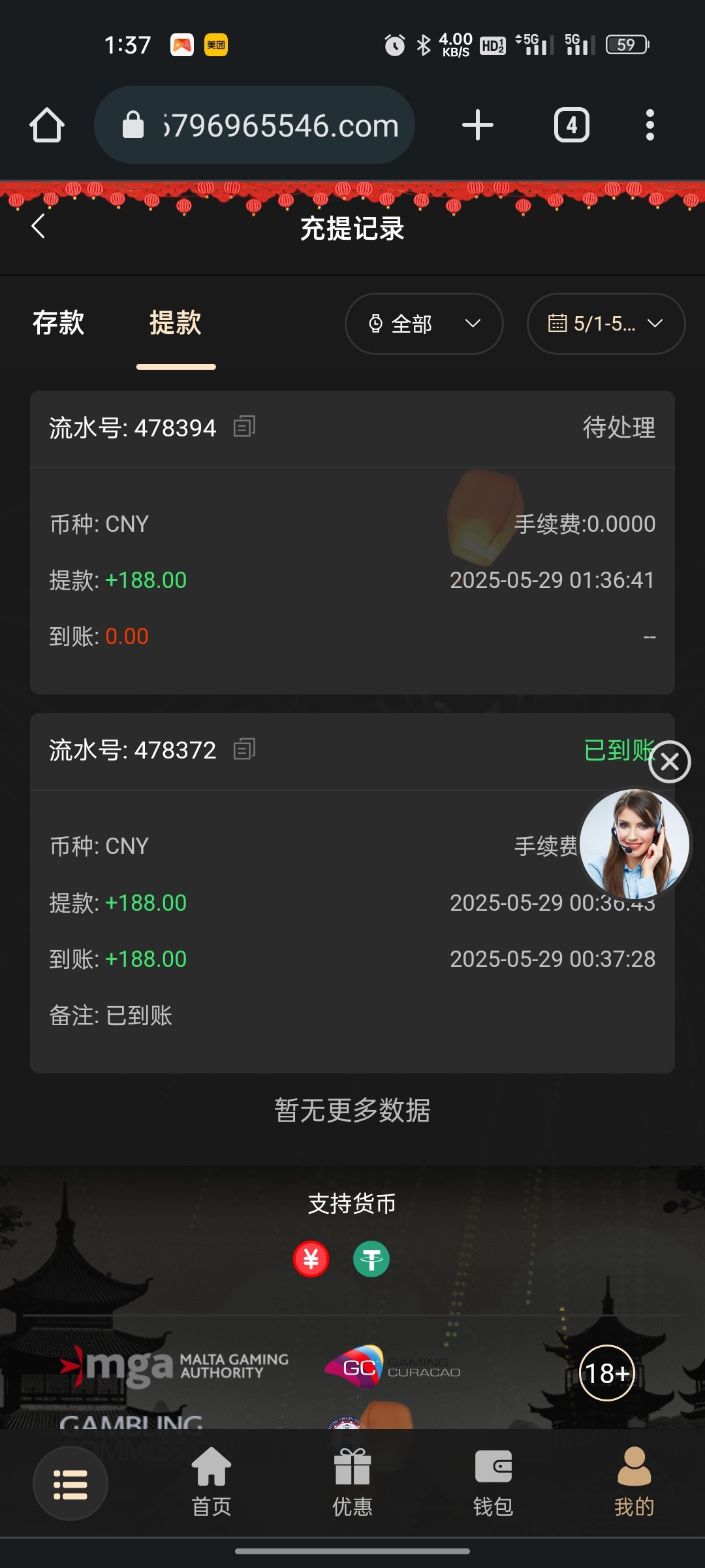 200+188 出500 直接买2块的福运买到1k刷完水剩500 提现有点慢