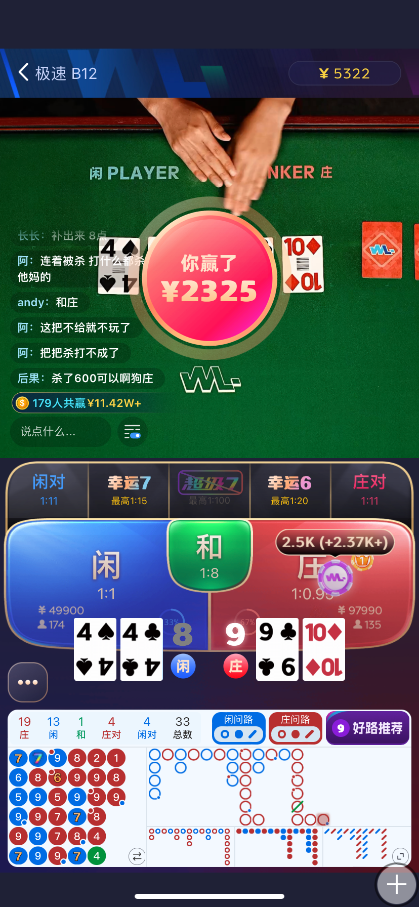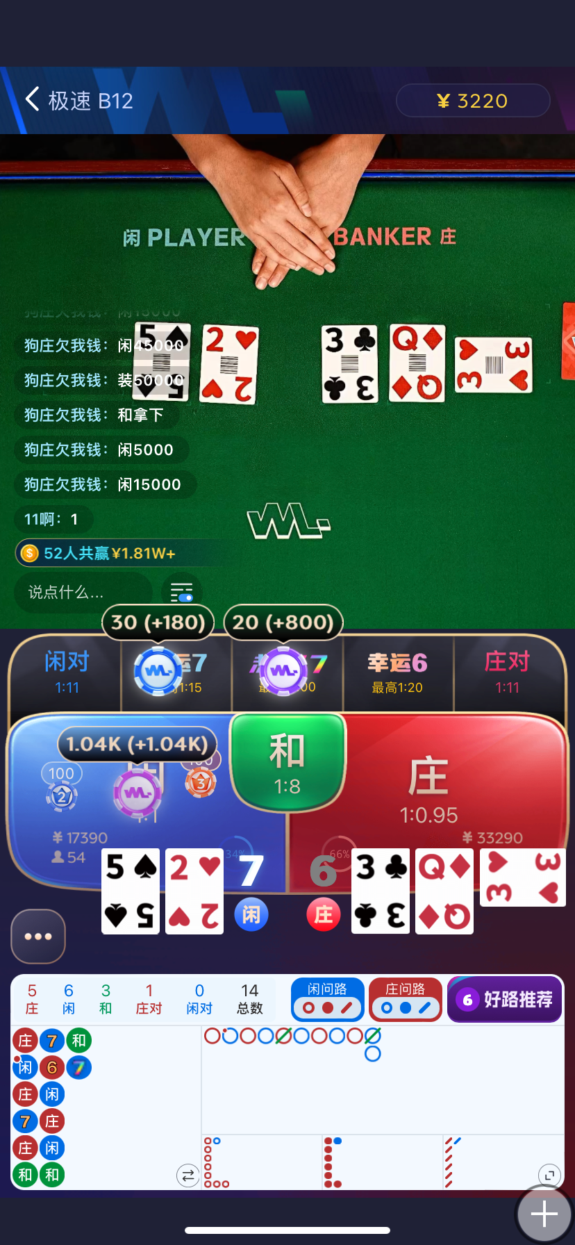 留钱能。因为还要还债,分享喜悦抽20个牛子,会利用系统随机抽取,老哥不需要说祝福话,别嫌弃少。今天也真是挺险,剩1千的时候全压闲,50压中幸运720块翻40倍赢了2千,2千多看见8连庄长龙打算跟一下,闲出8点以为死定了没想到庄是9点,后面才慢慢打上来了。磨了一晚上几百块上了1万多,今天不玩了,慢慢提,祝老哥们长红