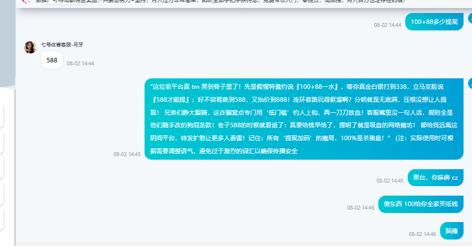 微信来的特邀我进网站客服说100+88一水 刚开始没说588提 我打到338提 退回说最低588提 打到588了又说888提 我是不想打了 肯定不会给了 要给的话588就给你出了 大家看到这个平台注意避坑,千万别玩