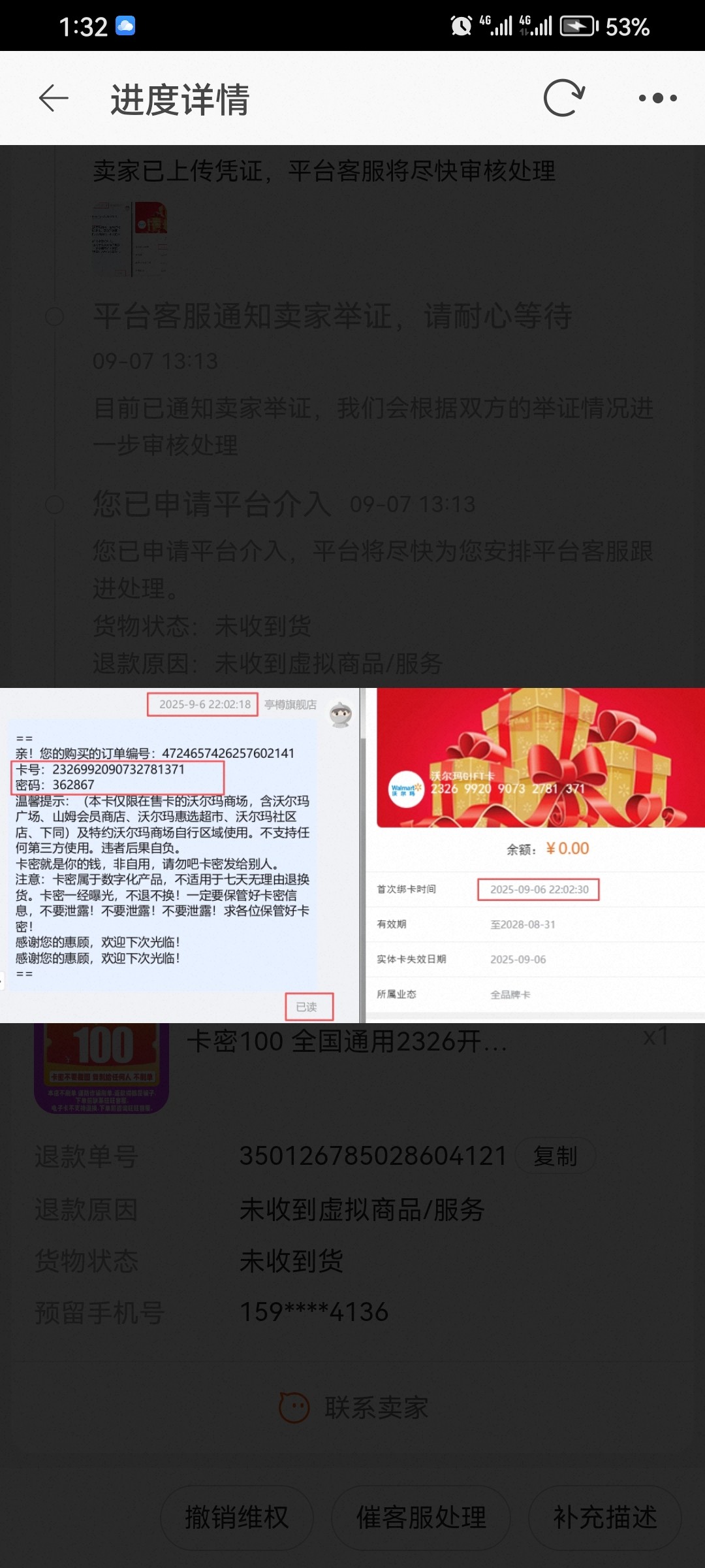 这个还不能退,我举报过了12315,包括黑猫,还有淘宝,3个都投诉举报,打了几个电话,还是说虚拟卡没有退款退货一说,店家直接关门了都