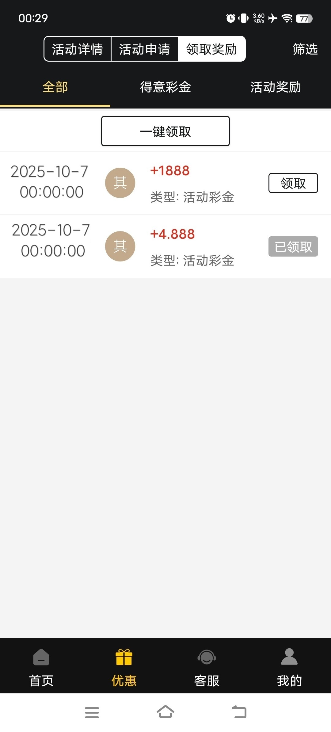 估计是给登录彩金10+10最多了。还有国庆红包。再来个登录福袋几块钱。还有双倍打码升级。个别台子再来个红包尾号7加倍