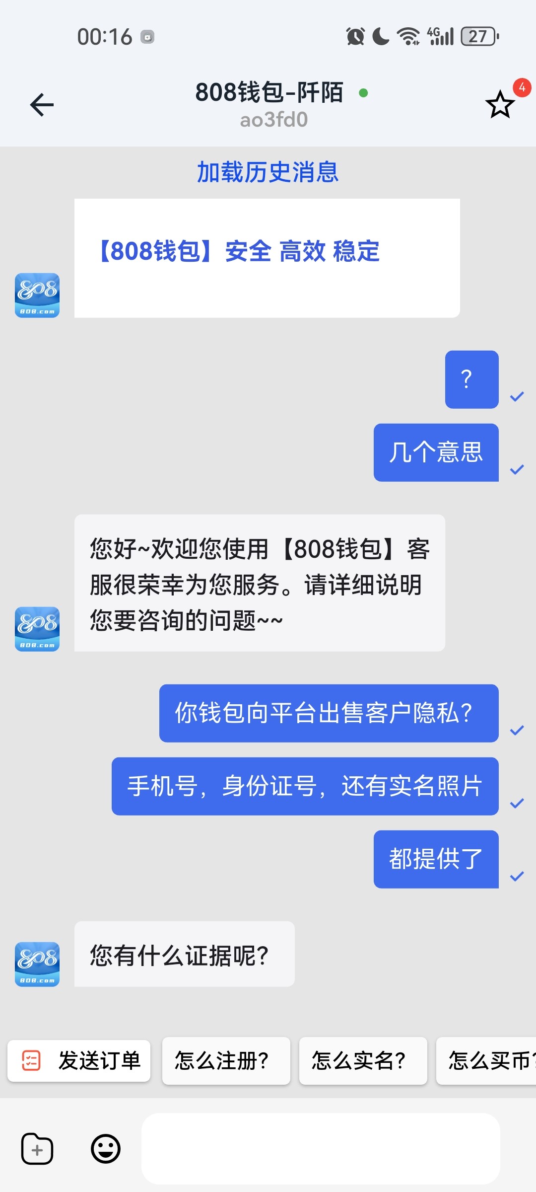 昨日曝光了一个平台名为“安盈彩票”的黑平台,今日闲来无趣,去调侃客服,结果呢,客服能直接把玩家在数字货币钱包的实名照片,最近登录识别照片,身份证照片,手机号什么的全扒出来,直接问是不是你,给我惊呆了,开始提倡数字钱包不就是因为可以避免风控同时可以保护隐私嘛,现在倒变相成为了狗庄收集玩家信息查证玩家资产几何的工具!根本毫无隐私可言!