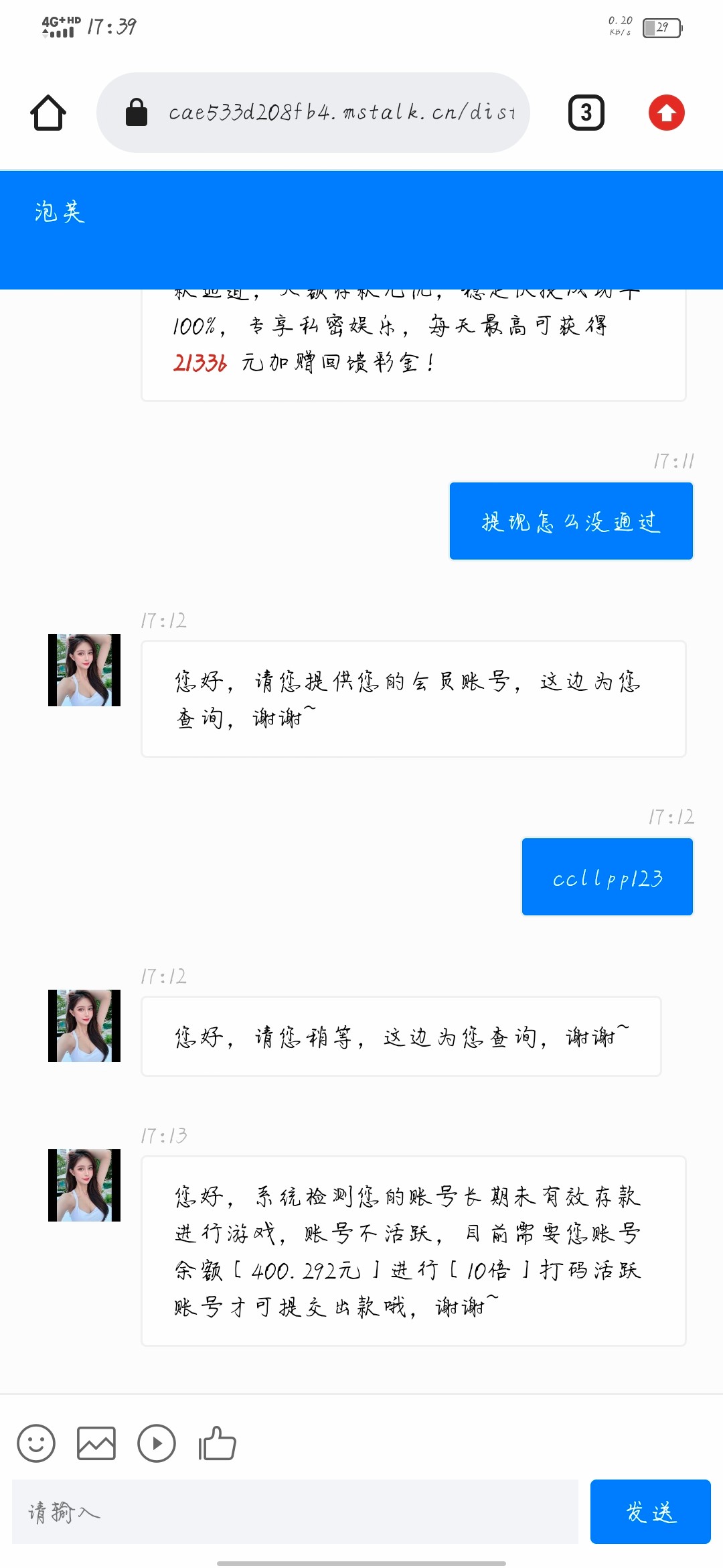 这个台,本来就黑,第一次500上3千多提现一个多小时,第二次1000上7000,退回账号,说银行卡号错了,重新提供银行卡号,然后下午出款,到晚上才到账,玩不起